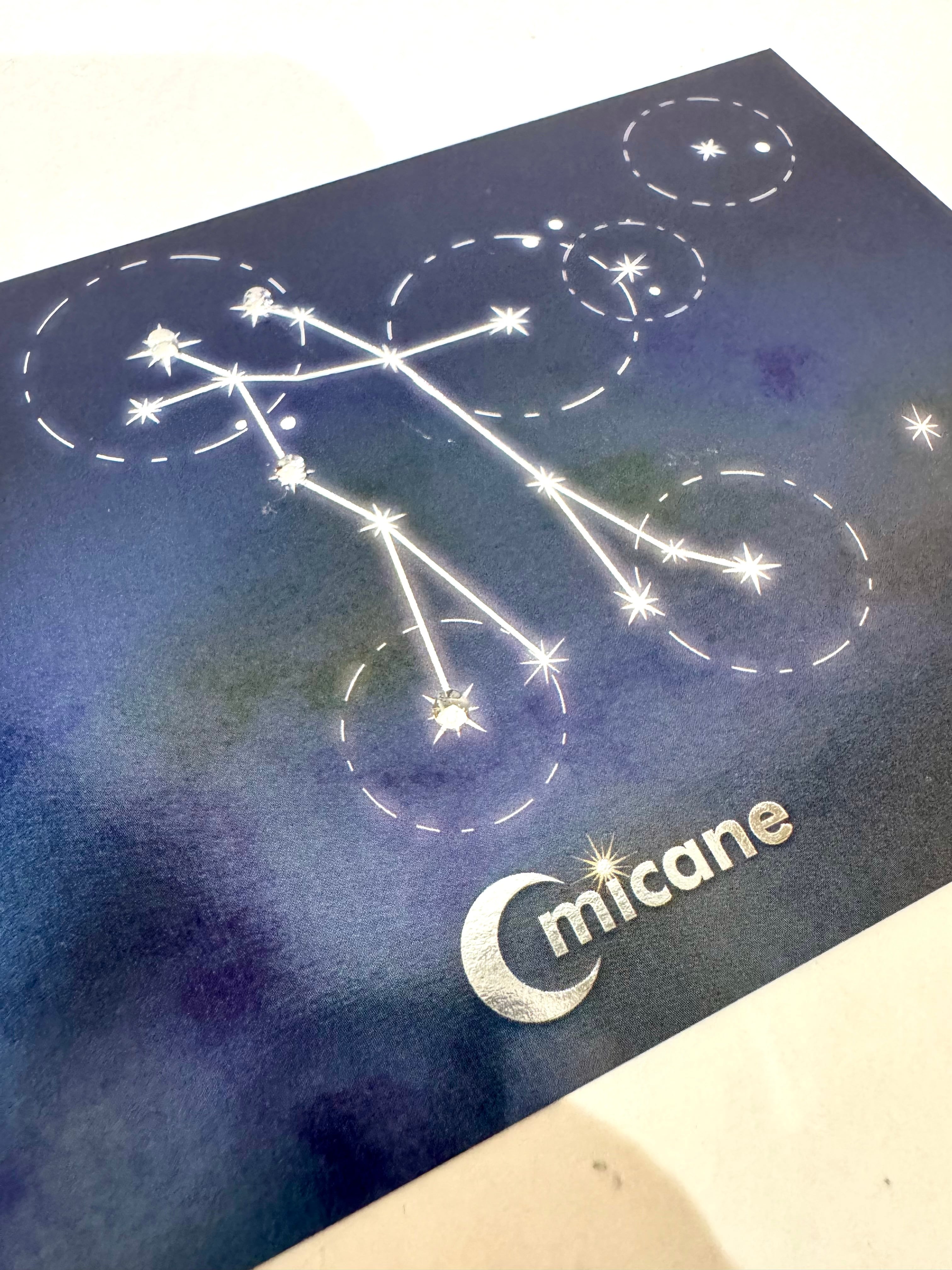 夜空に広がる双子座の星の並びを、ポストカードサイズの守り絵に映し取りました。