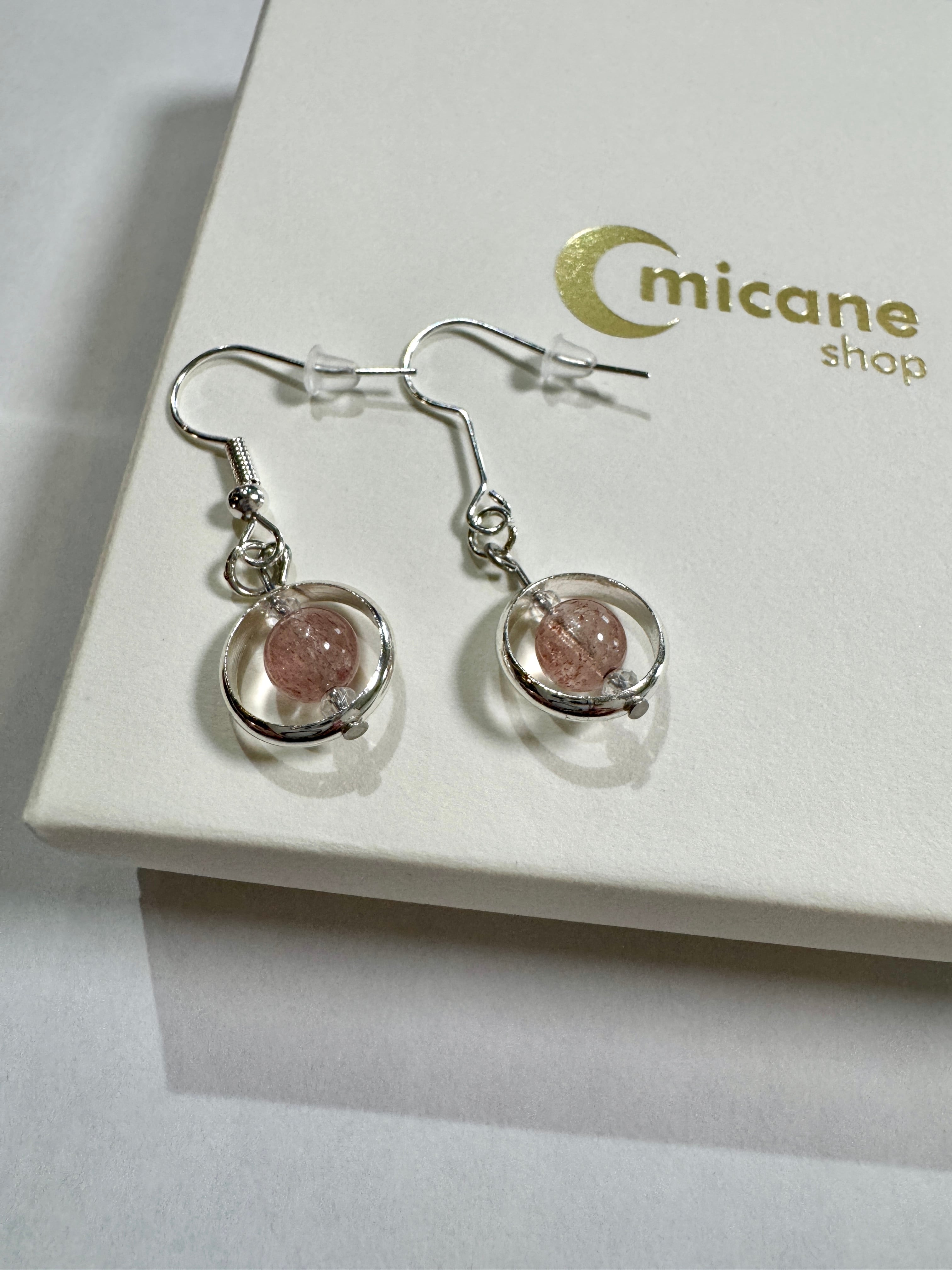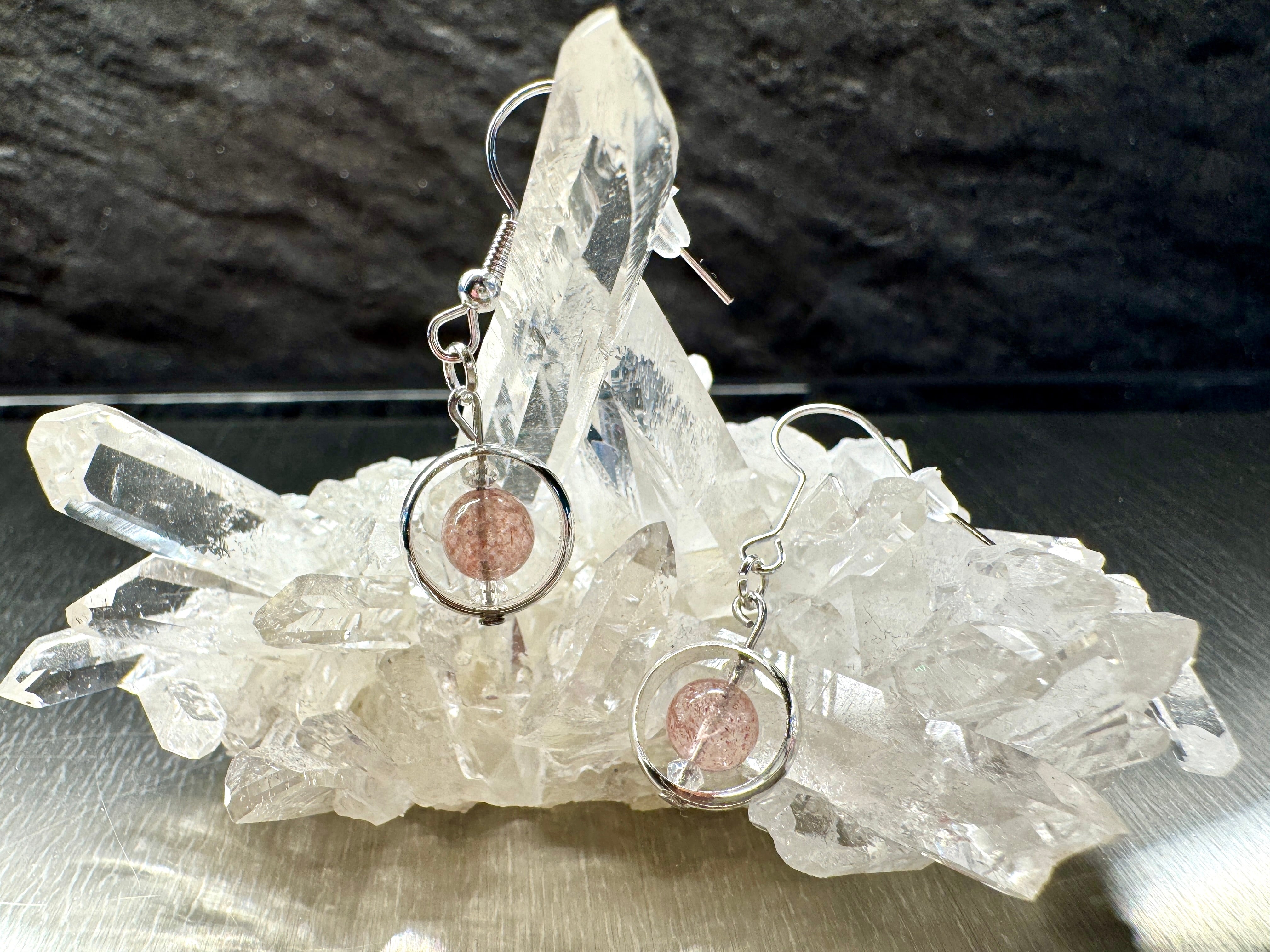 ストロベリーローズクォーツ(紅水晶)と、月の光を思わせるシルバーパーツで仕立てた「恋愛・縁結びのタリスマンピアス」です。