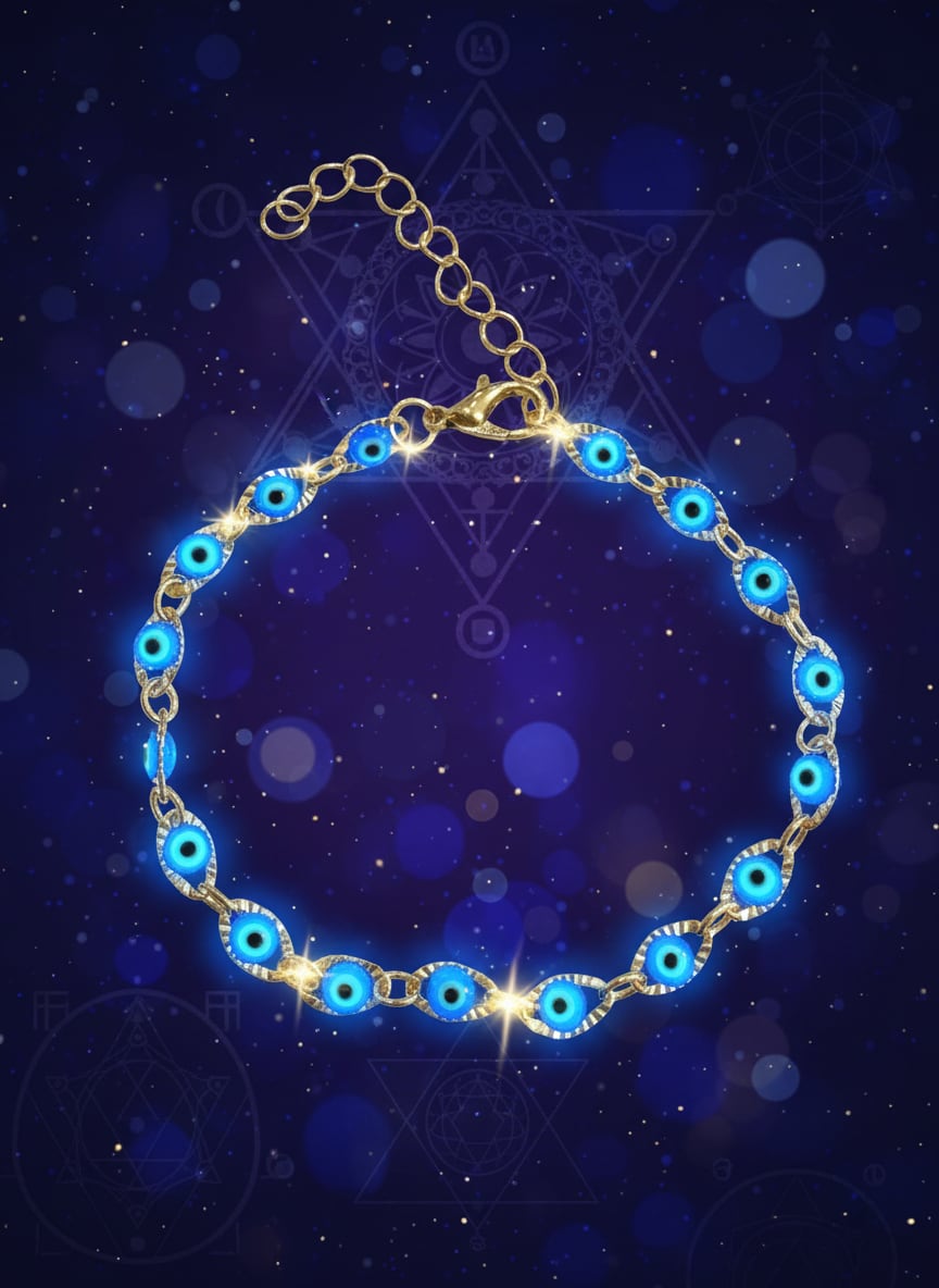 ・ブルー×ゴールドの色彩コントラスト — 青い“目”のビーズが深く鮮やかに、ゴールドのチェーンが高級感と華やかさを演出。