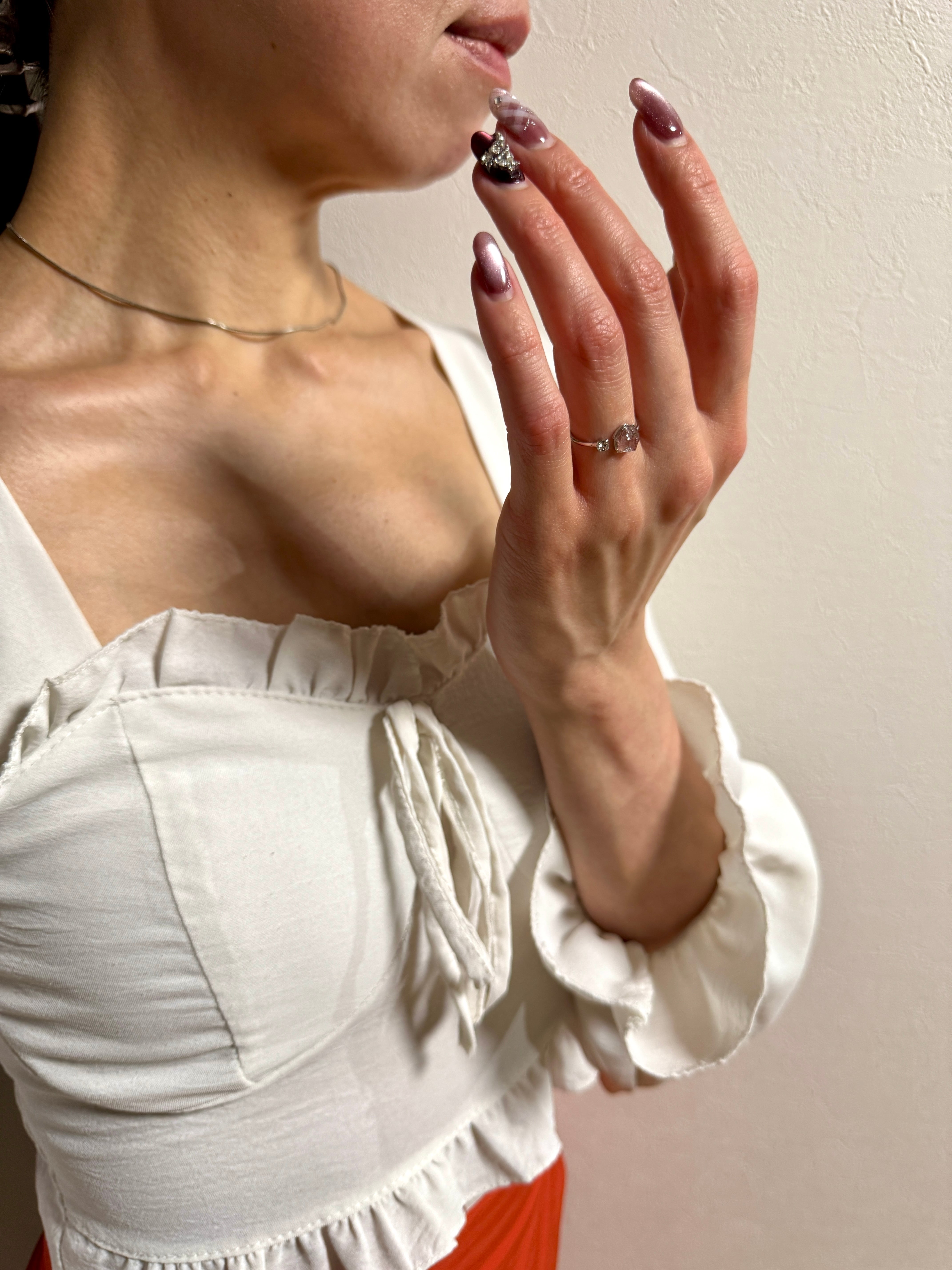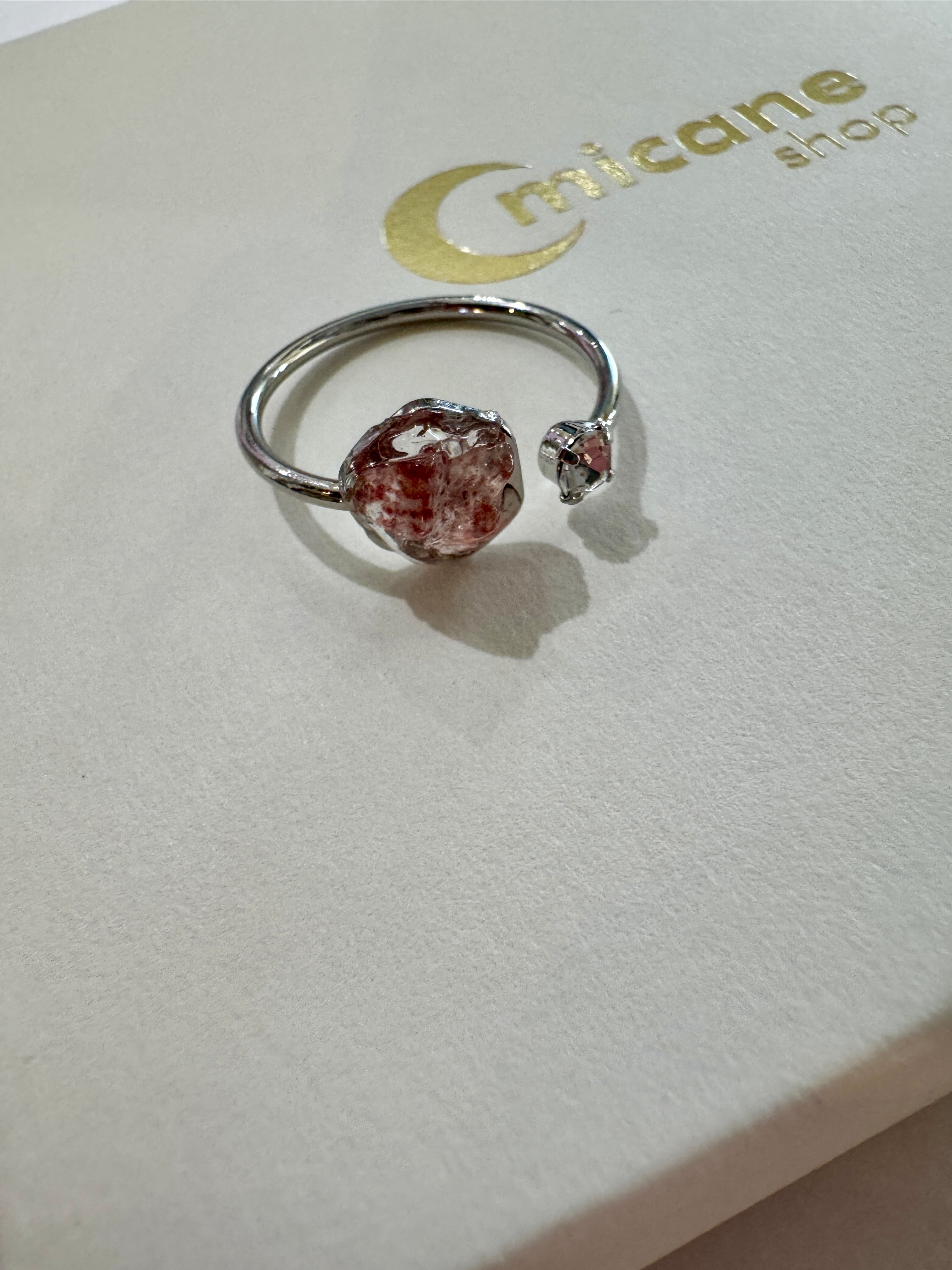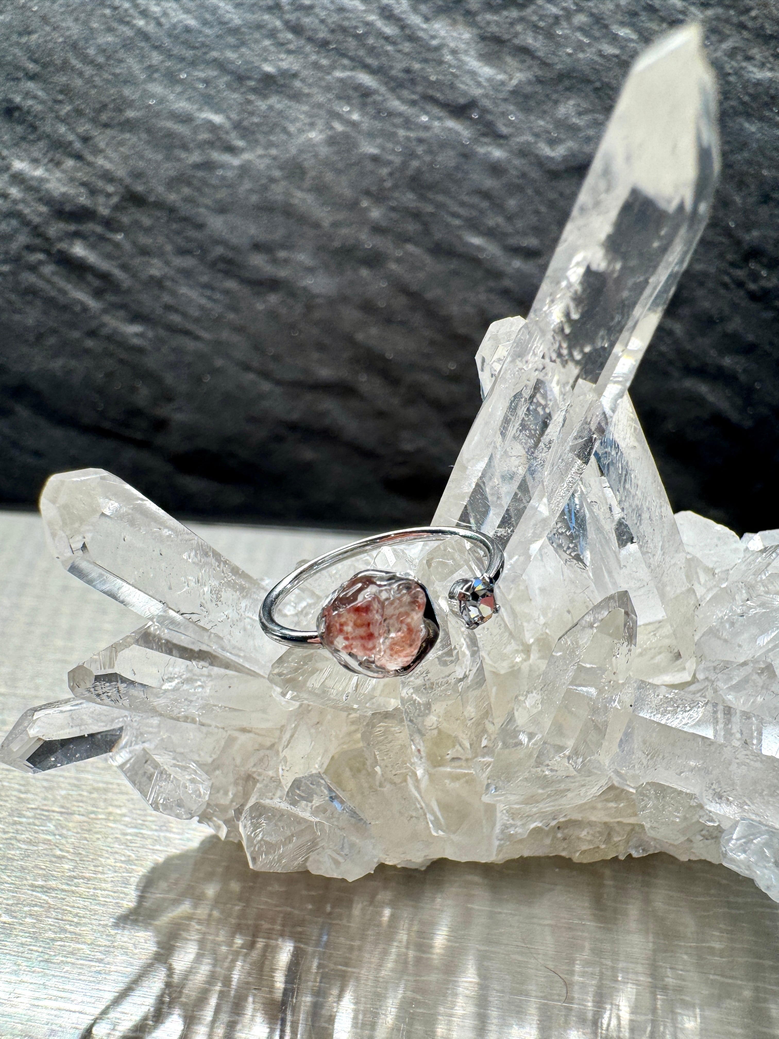 ストロベリーローズクォーツ(紅水晶)のさざれ石と、月の光を思わせるシルバーチャームで仕立てた「恋愛・縁結びのタリスマンリング」です。