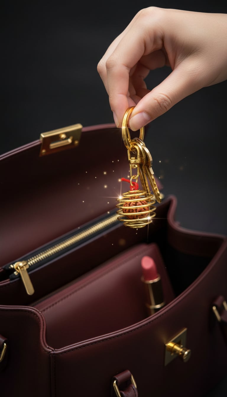 このキーホルダーは、シヴァ神の涙と伝えられる5ムキ・ルドラクシャに、「豊かさ」「光」「繁栄」を象徴するゴールドビーズ、そして「生命力・守護」を司る赤い紐を組み合わせた神聖な守護具です。
