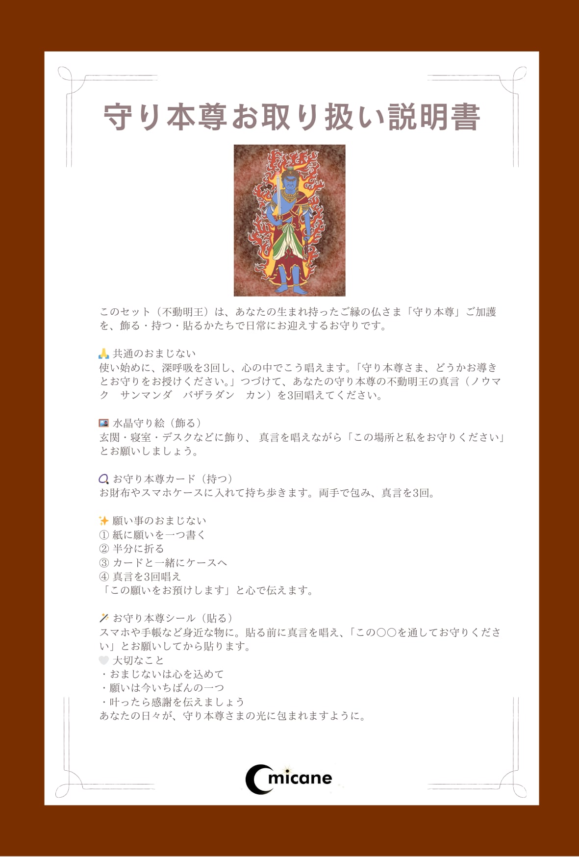守り絵と共にお届けするお取扱説明書に沿って心願成就のおまじないを行っていただくことで、