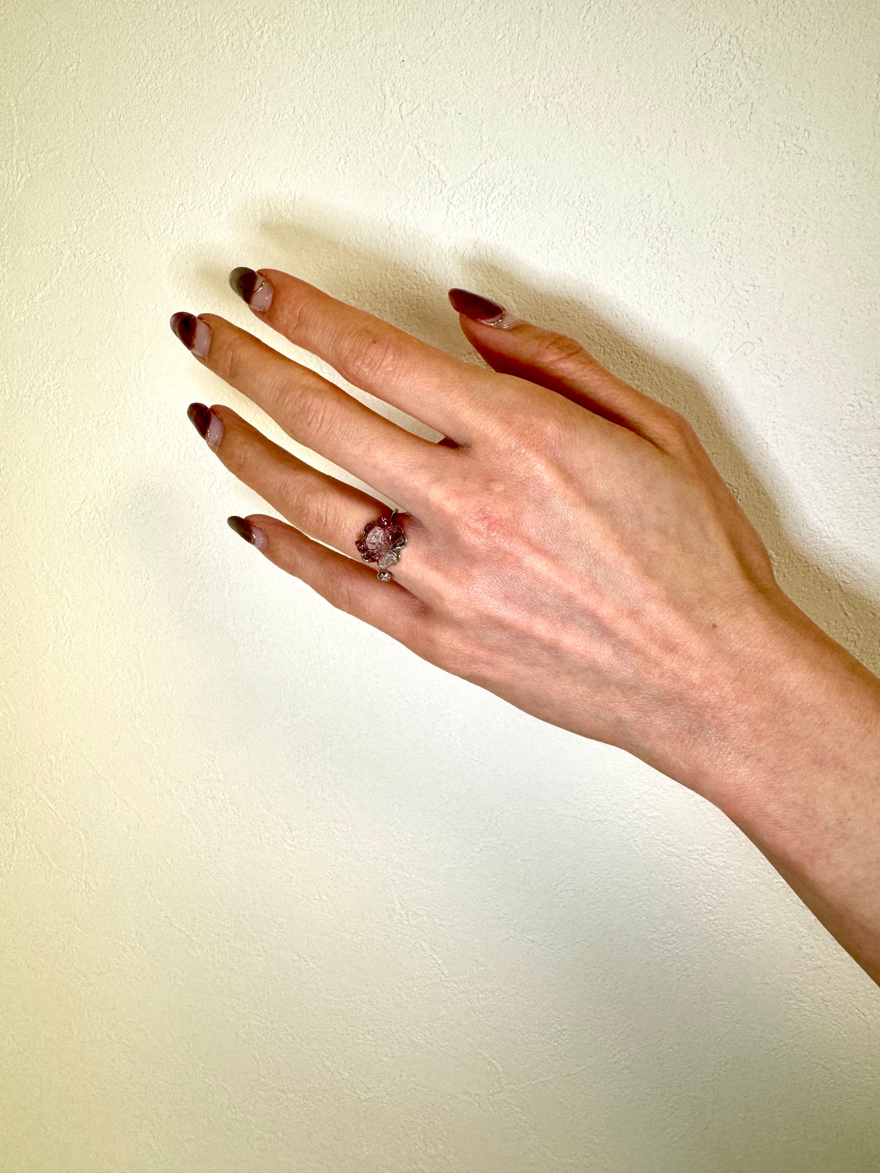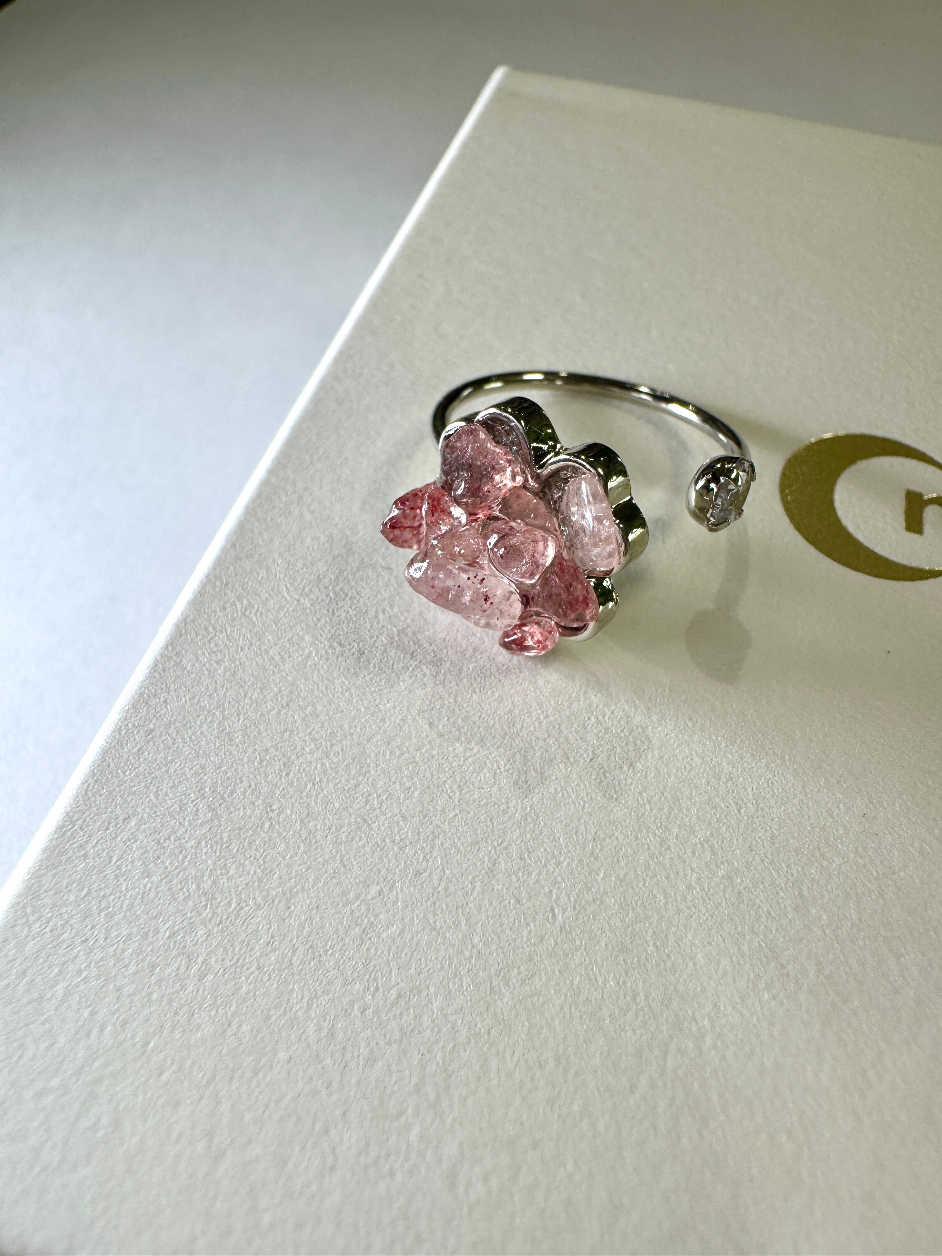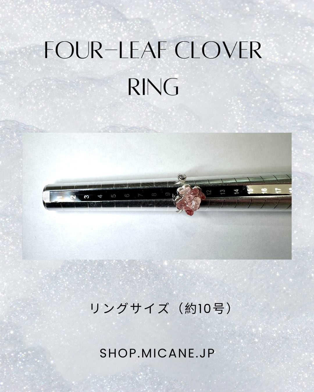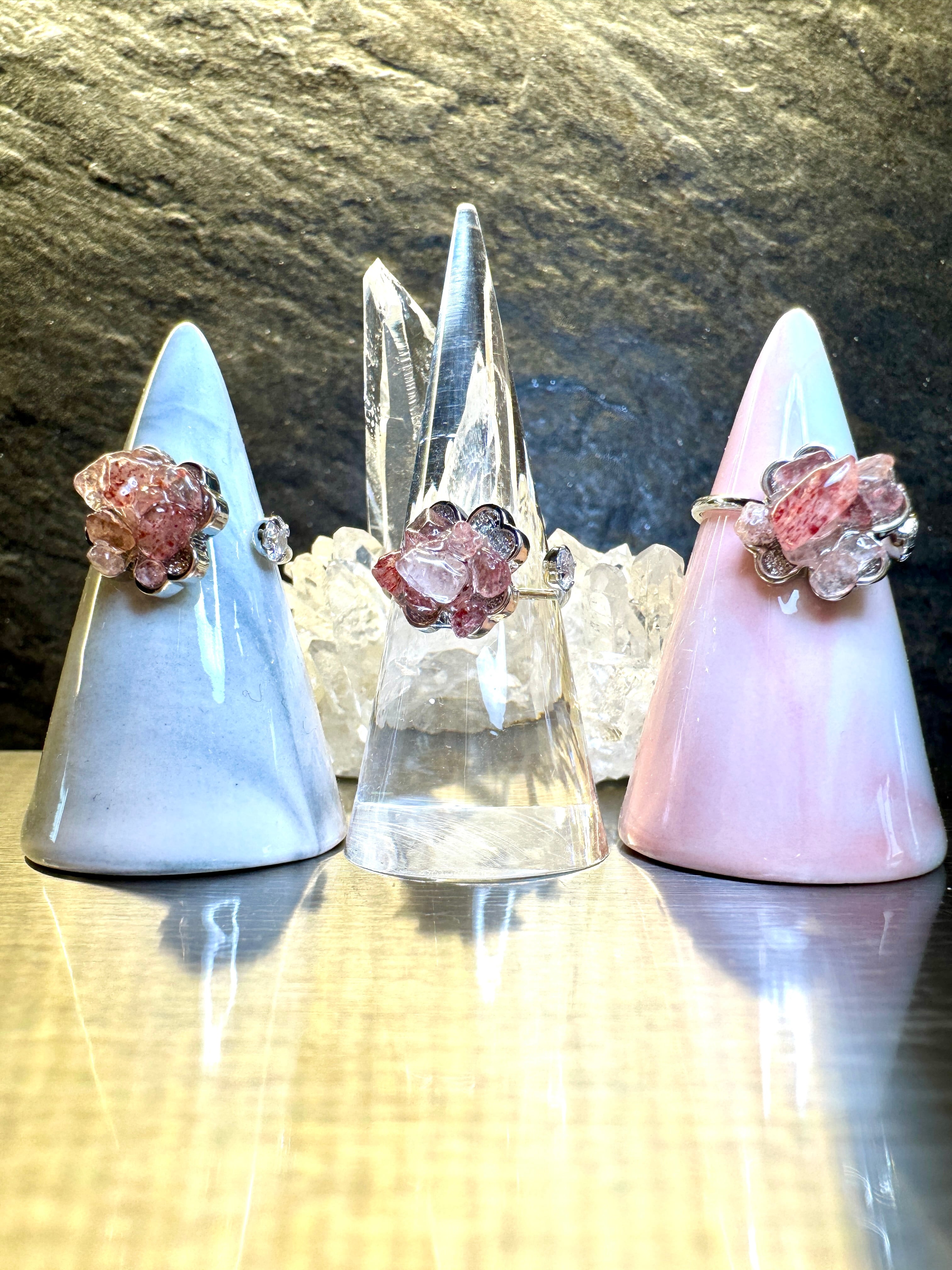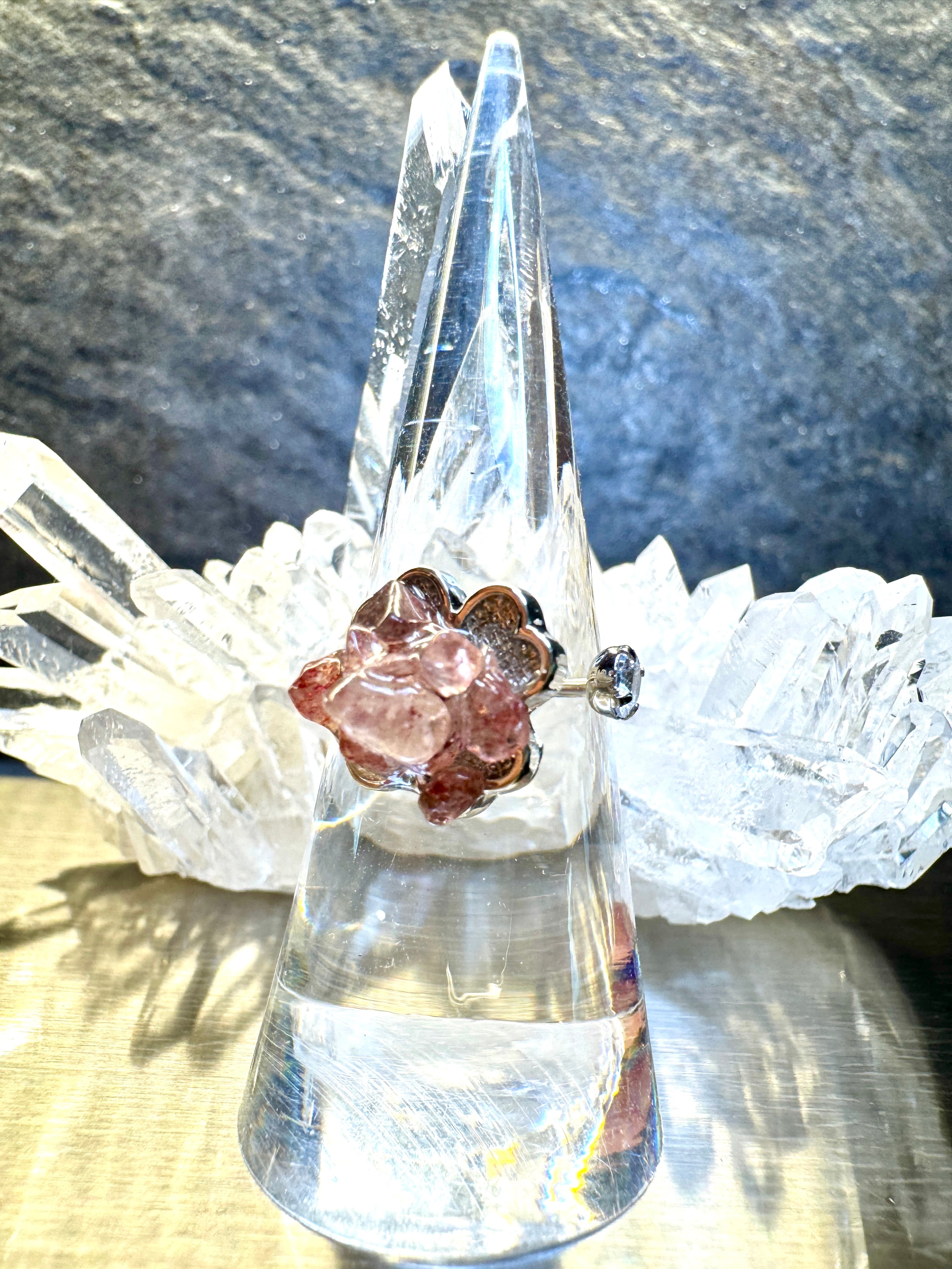 ストロベリーローズクォーツ(紅水晶)のさざれ石と、月の光を思わせるシルバーチャームで仕立てた「四葉のクローバー タリスマンリング」です。