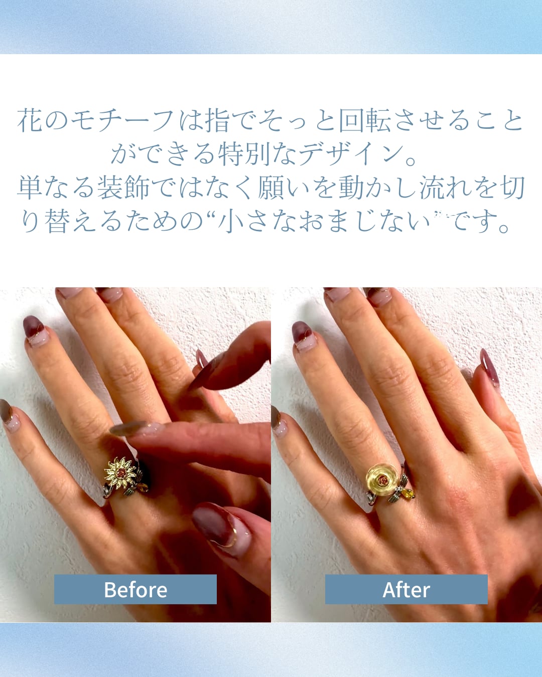 頑張ってきた自分を、そろそろ“受け取りたい”とき流れを変えたい、一区切りをつけたいとき、自分の内側の女性性・直感を信じたいとき、動かすことで完成するお守りとして、日常の中で何度でも、静かに想いを込められるリングです。