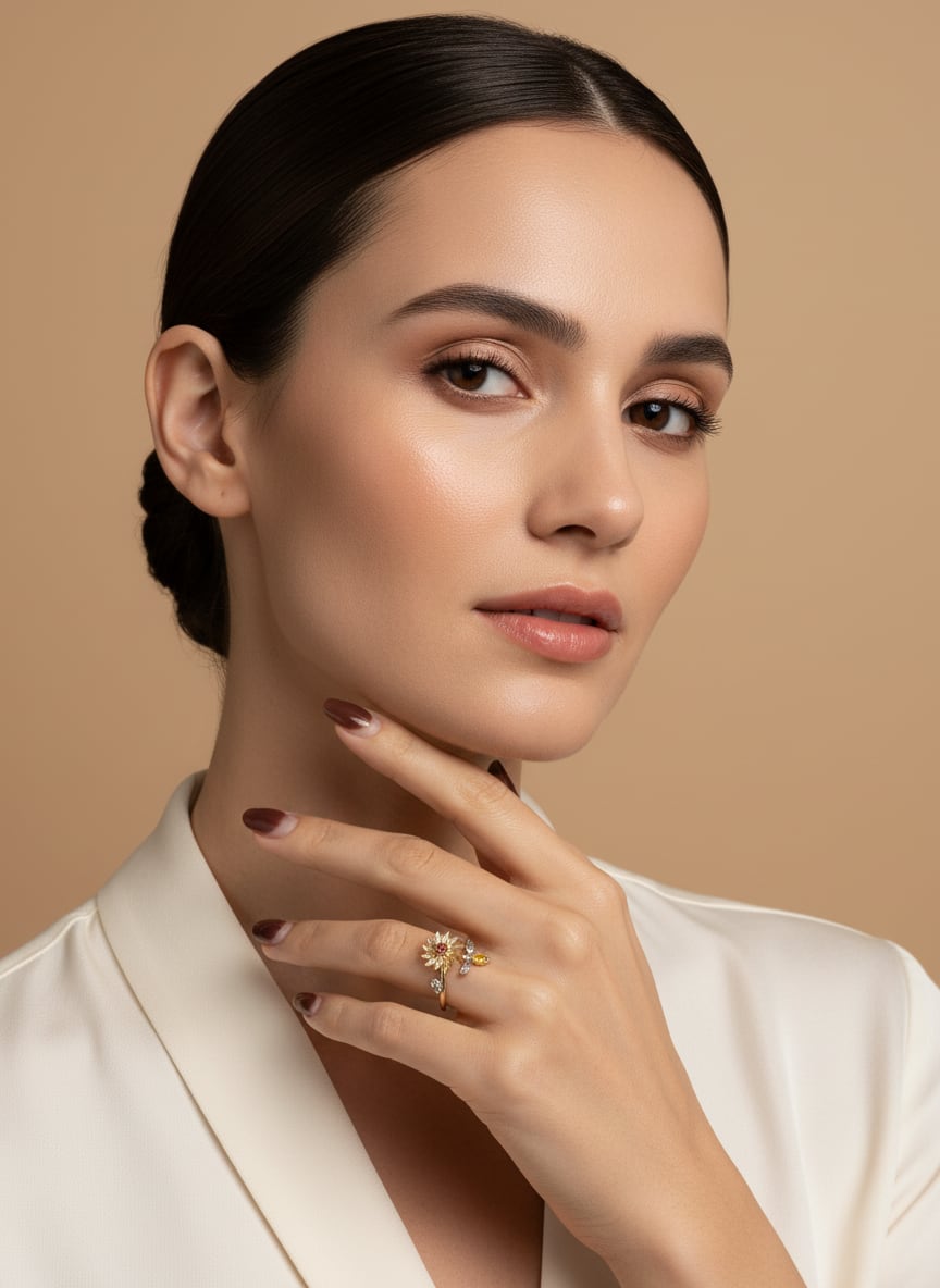 このリングの花のモチーフは指でそっと回転させることができる特別なデザイン。