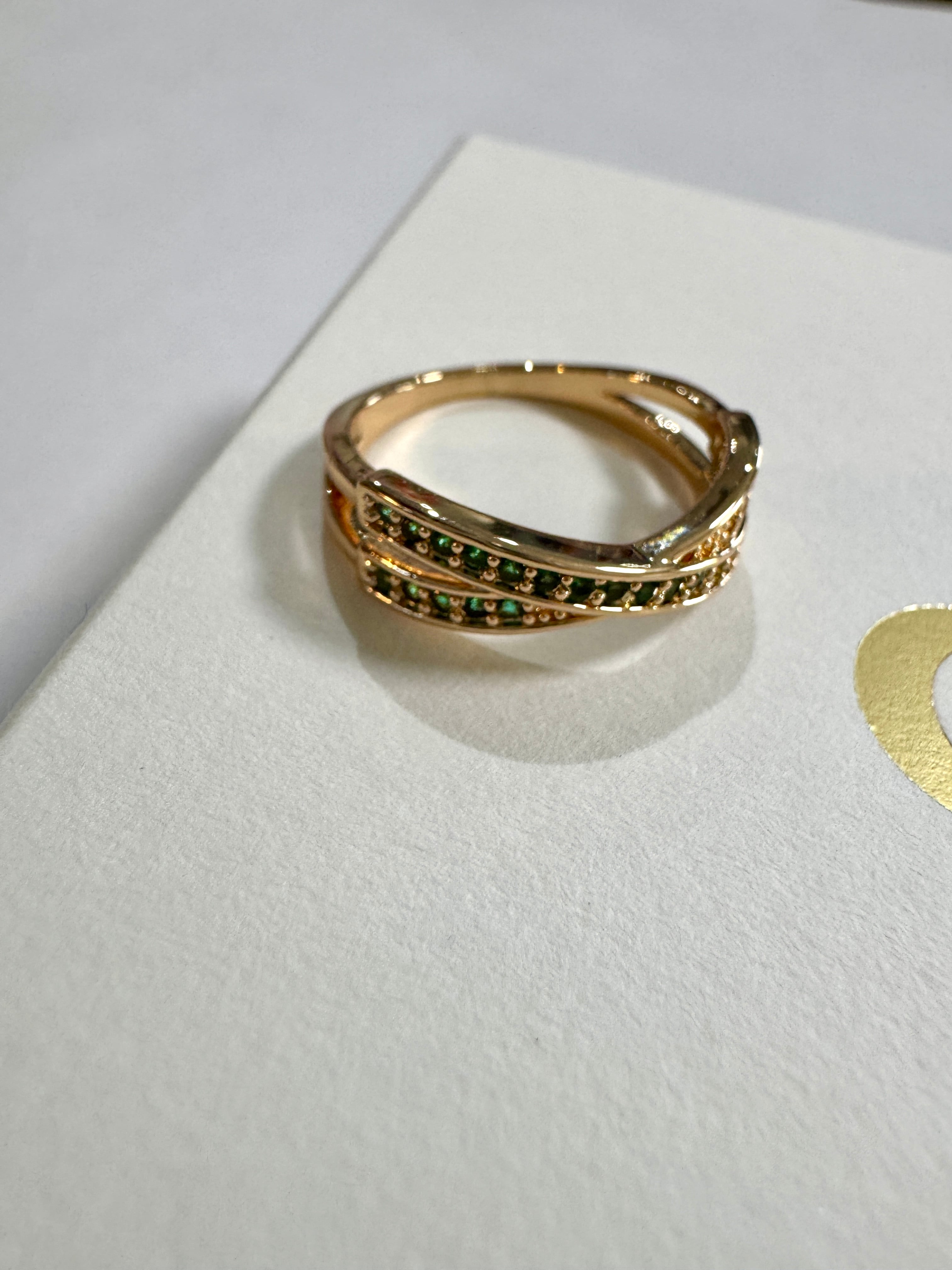 ゴールドのラインが美しく重なり合うデザインのリング。
