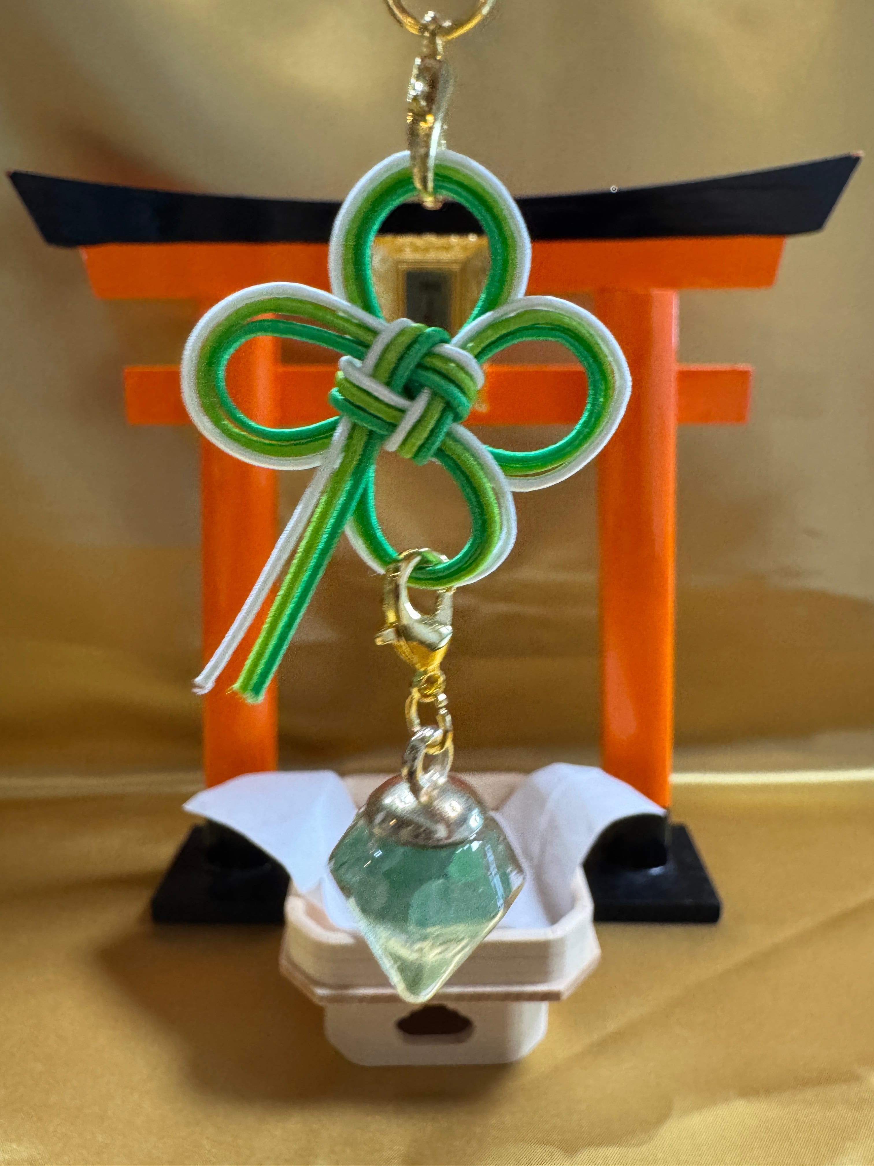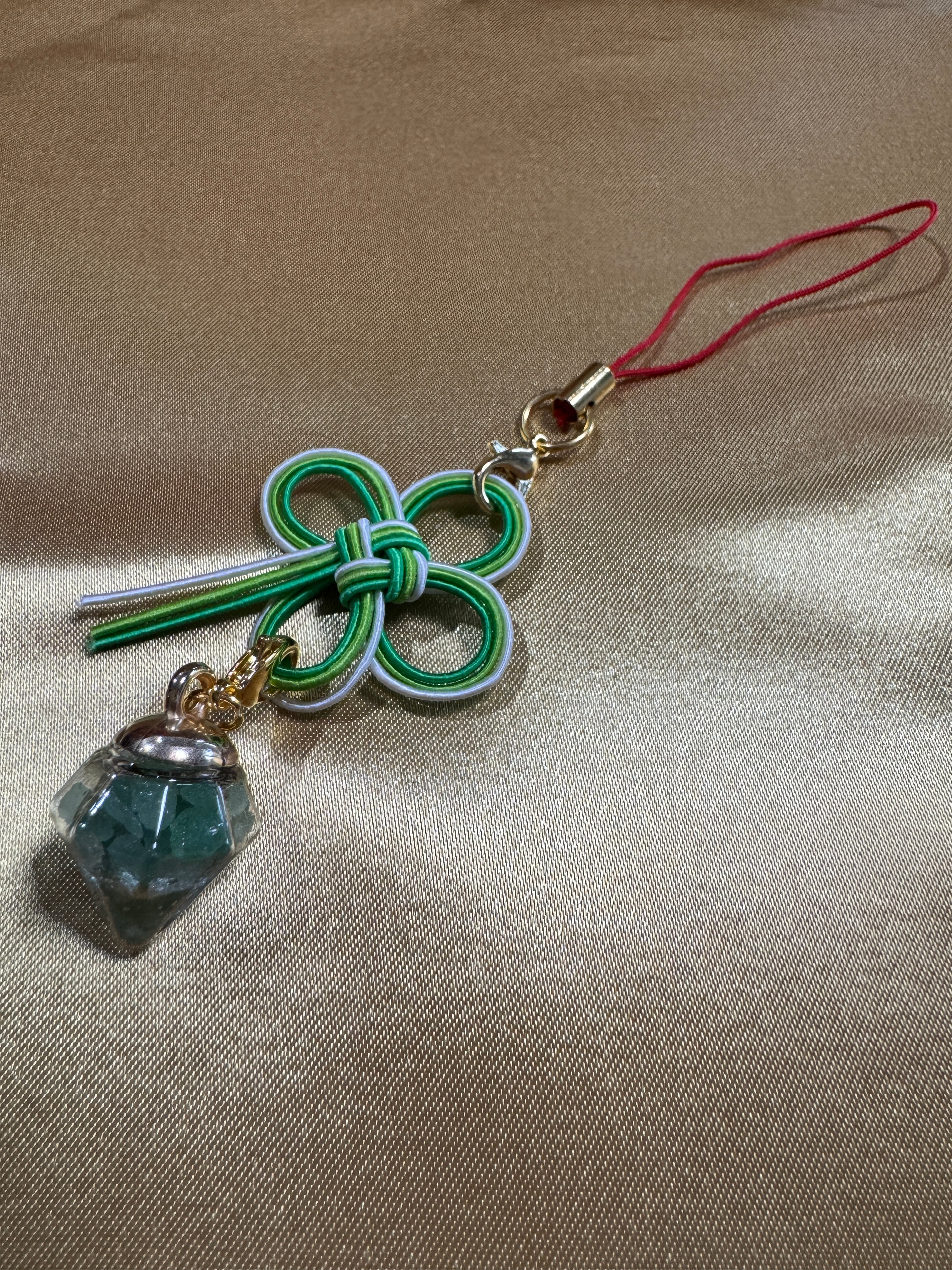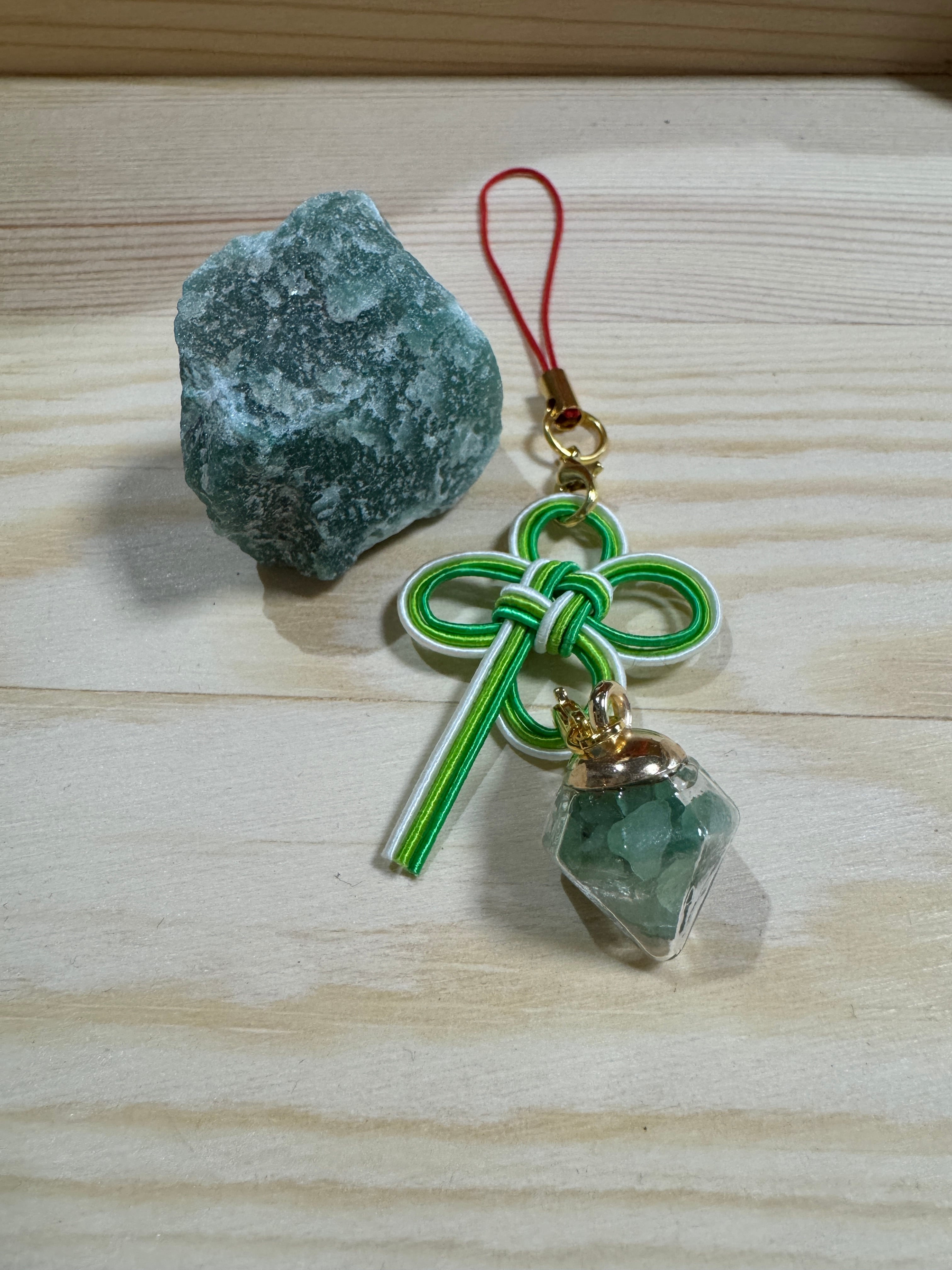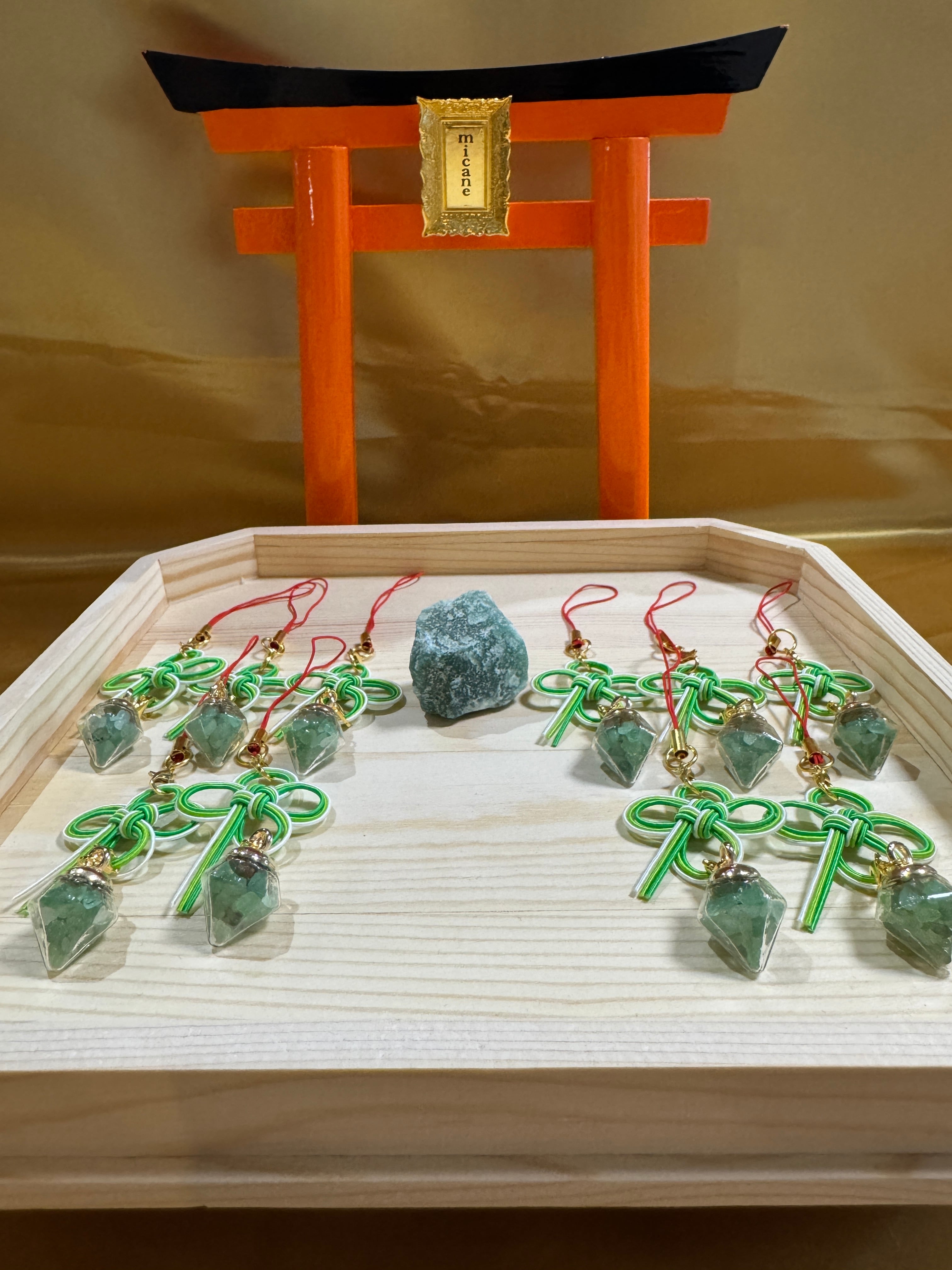 緑水晶(グリーンアベンチュリン)を宿した守り珠を添えています。